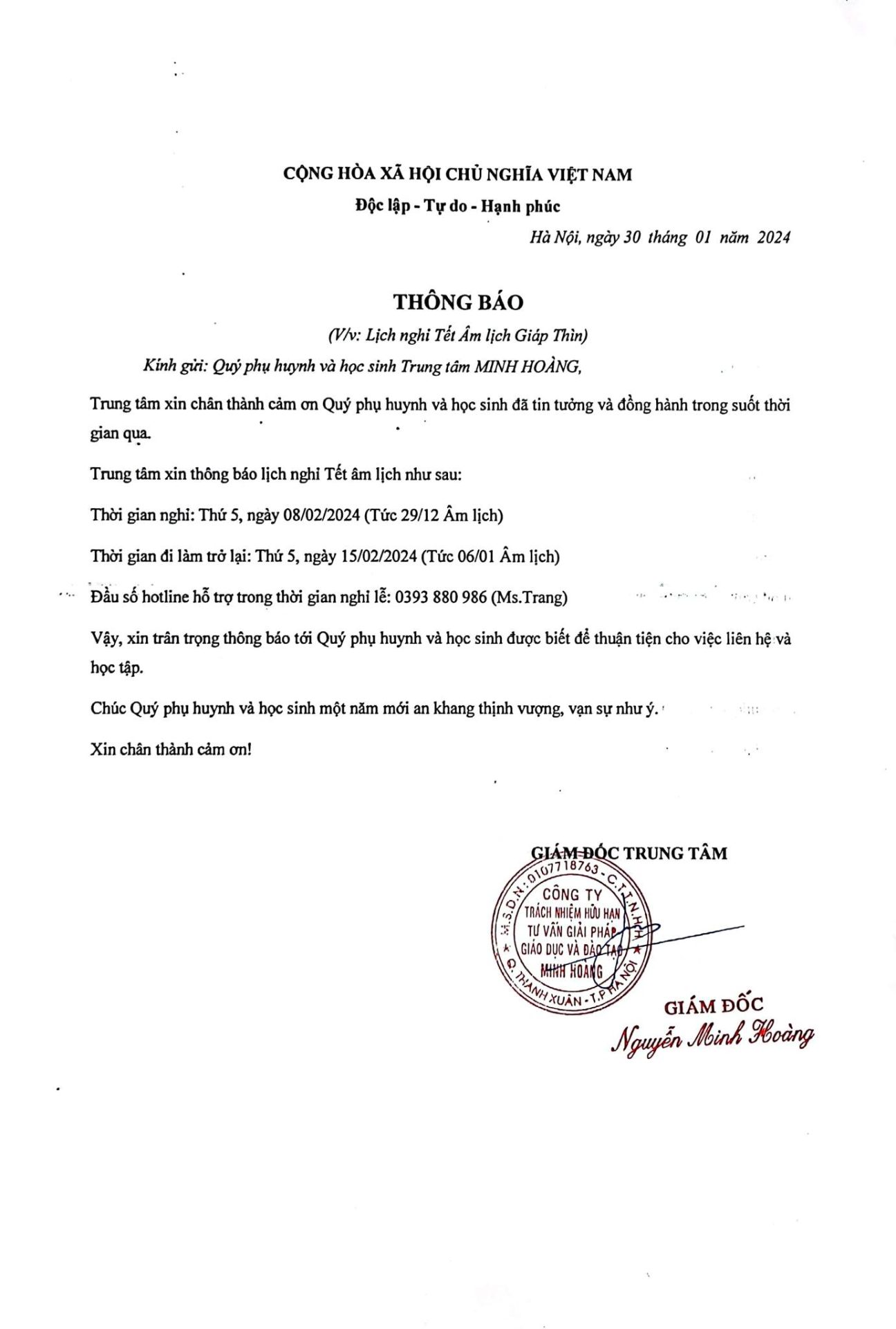 Kính gửi: Quý phụ huynh và các em học sinh Trung tâm Minh Hoàng, Trung tâm xin chân thành cảm ơn Quý phụ huynh và các em học sinh đã tin tưởng và đồng hành trong suốt thời gian qua. Trung tâm xin thông báo lịch nghỉ Tết âm lịch