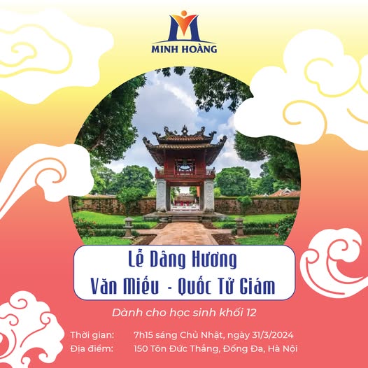 Vừa qua, Trung tâm Giáo dục Minh Hoàng đã tổ chức thành công Lễ Dâng Hương tại Văn Miếu – Quốc Tử Giám, một hoạt động ý nghĩa dành cho các em học sinh trước thềm kỳ thi chuyển cấp quan trọng. Buổi lễ được diễn ra trong không khí