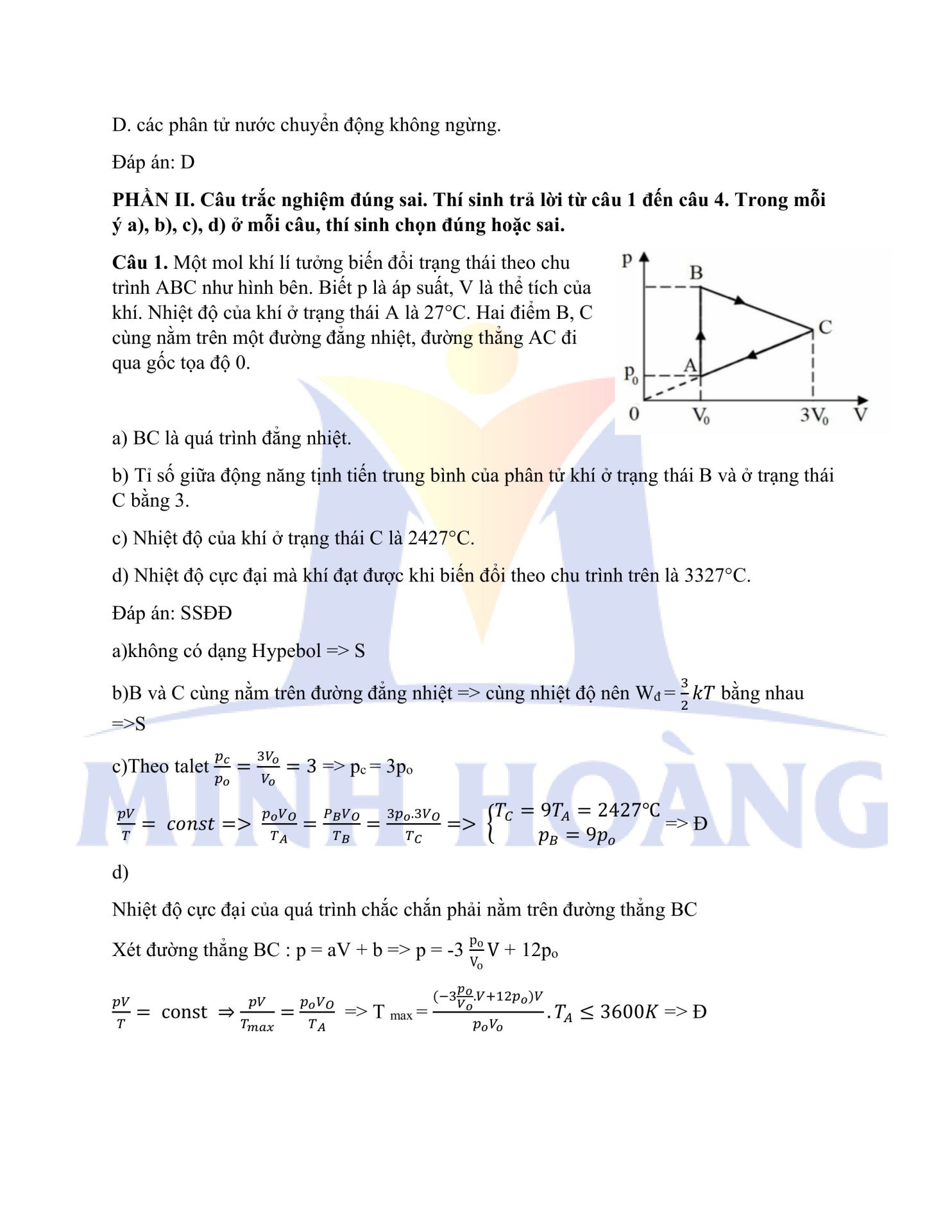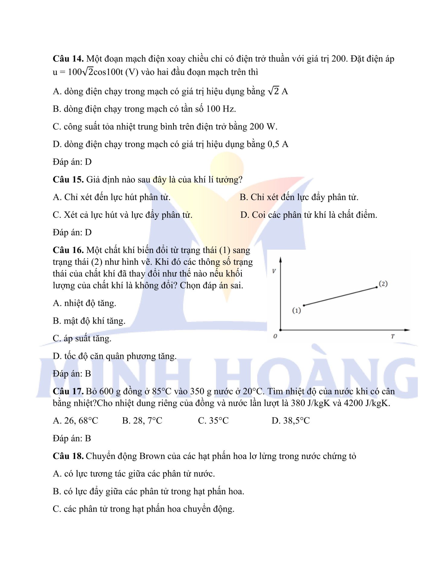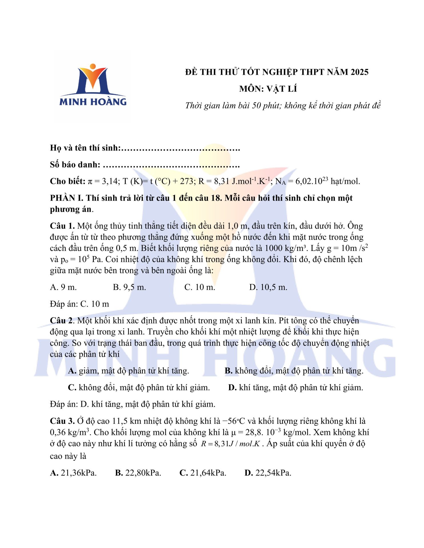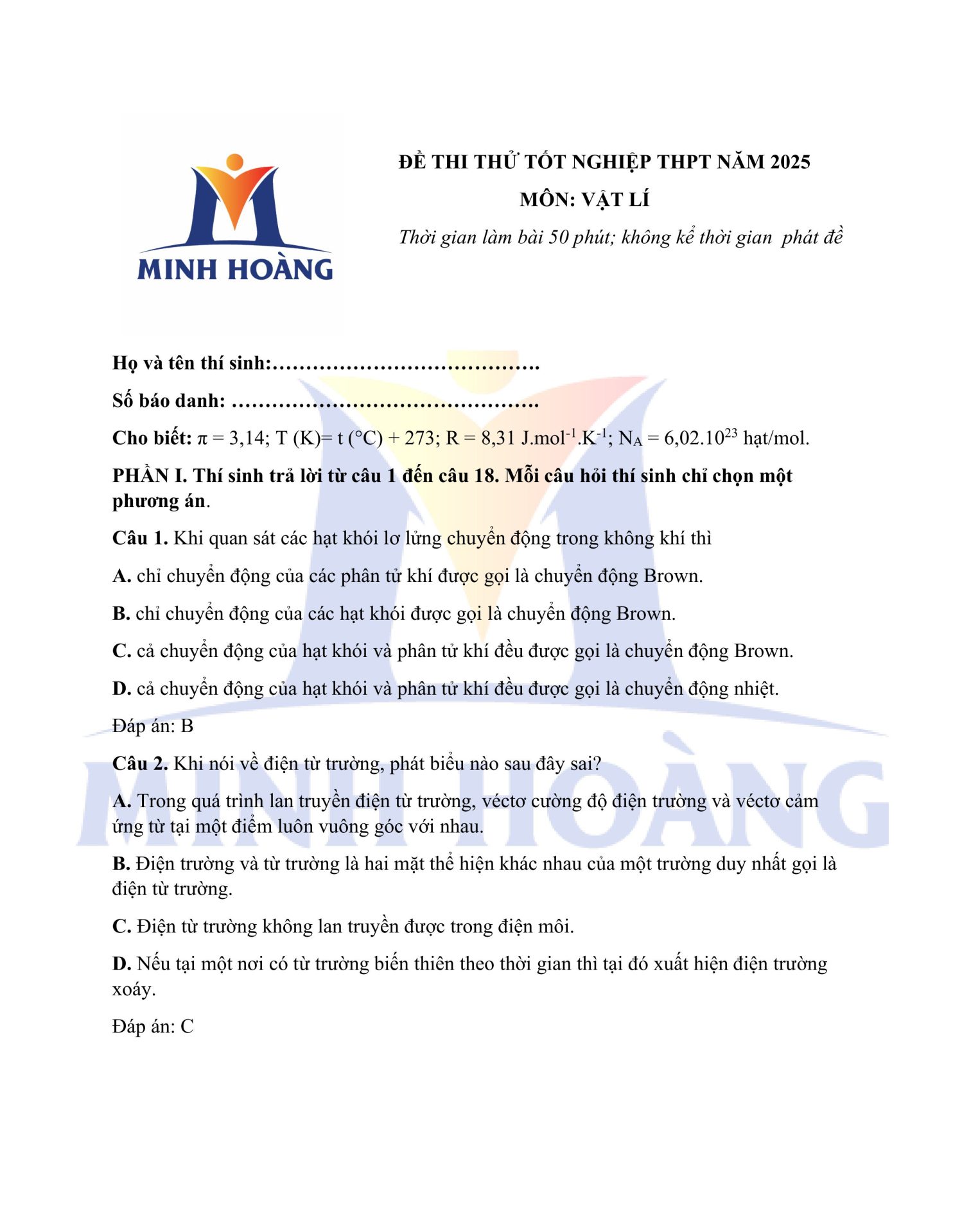 Đáp án chính thức môn Vật Lý – Kỳ thi thử Tốt nghiệp THPT tại Trung tâm Minh Hoàng