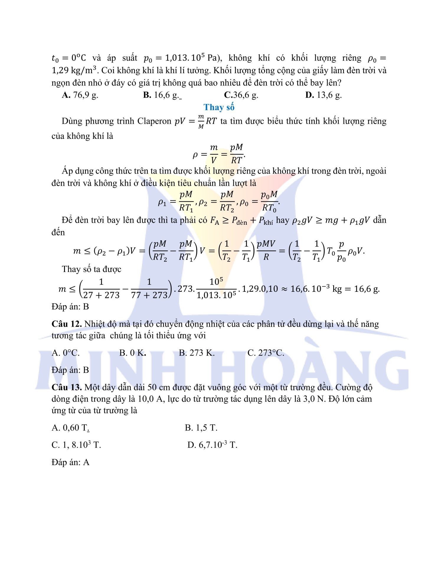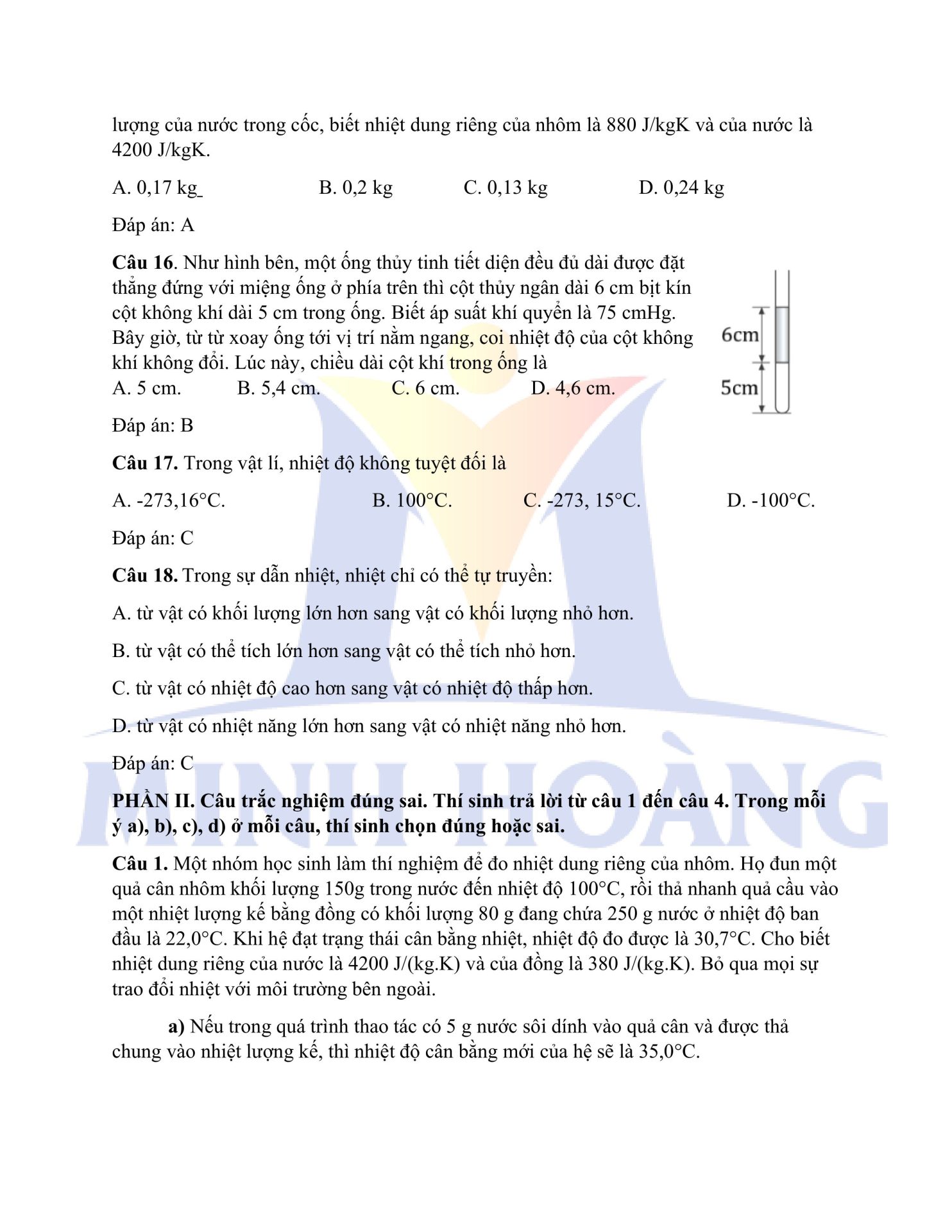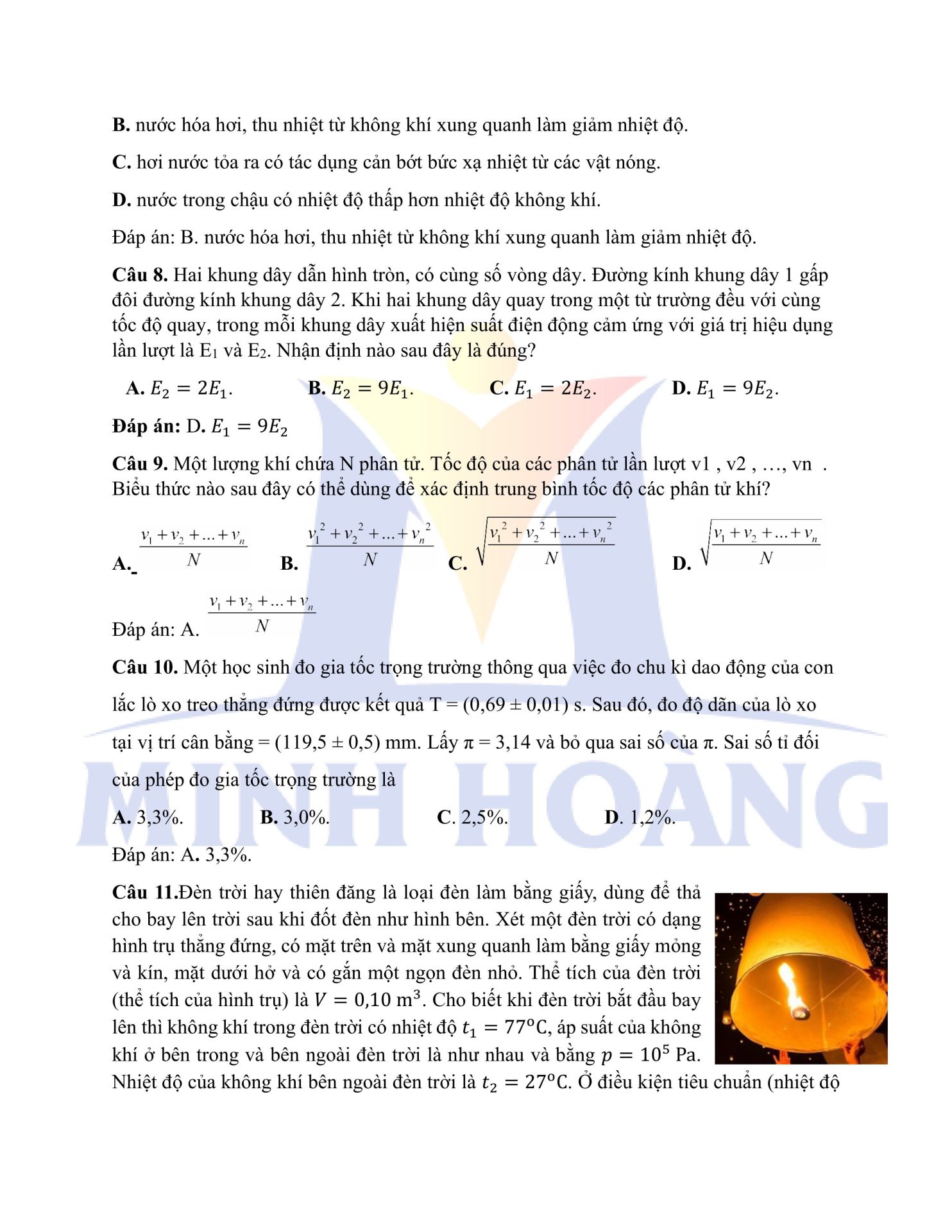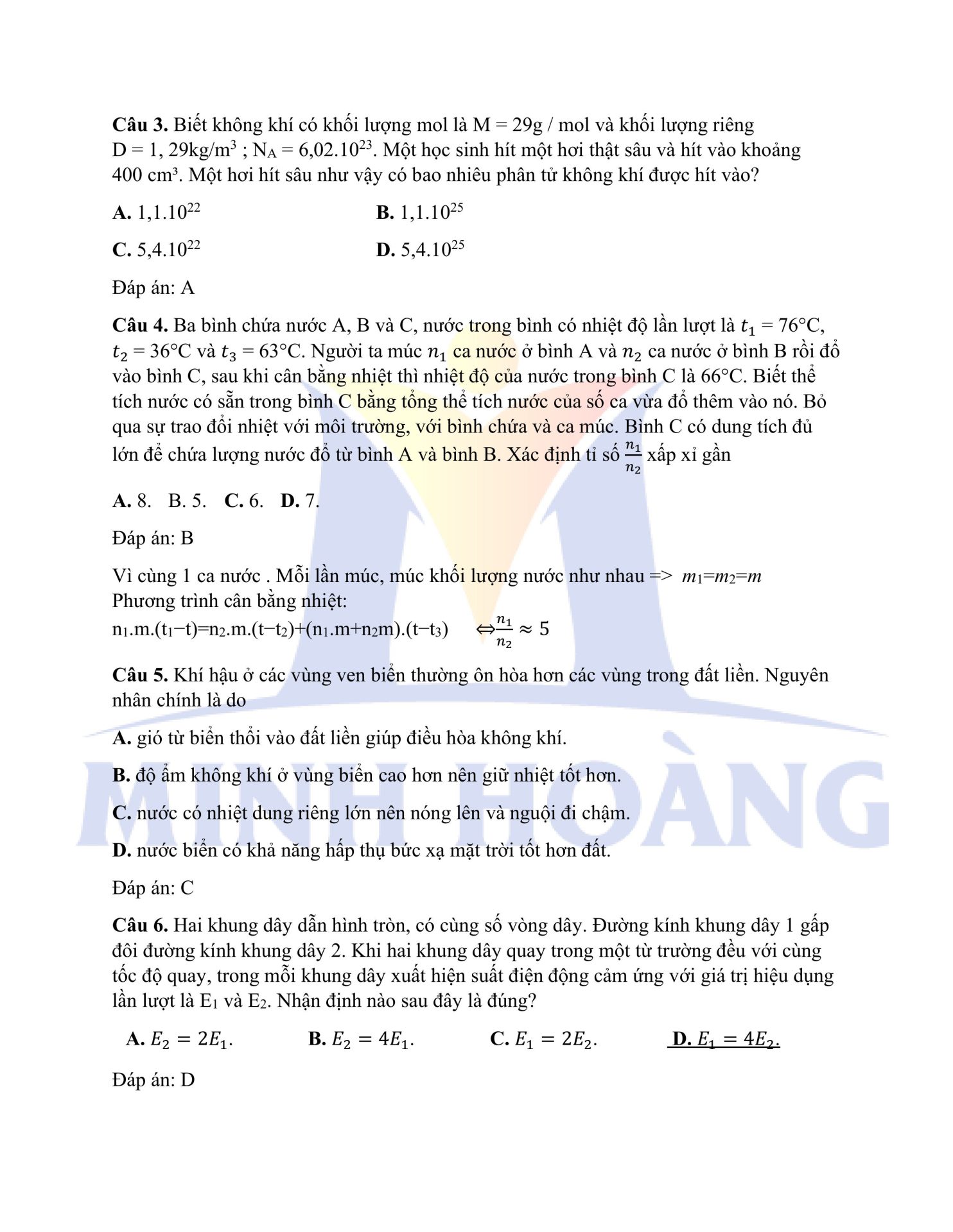 Đáp án chính thức môn Vật Lý – Kỳ thi thử Tốt nghiệp THPT tại Trung tâm Minh Hoàng