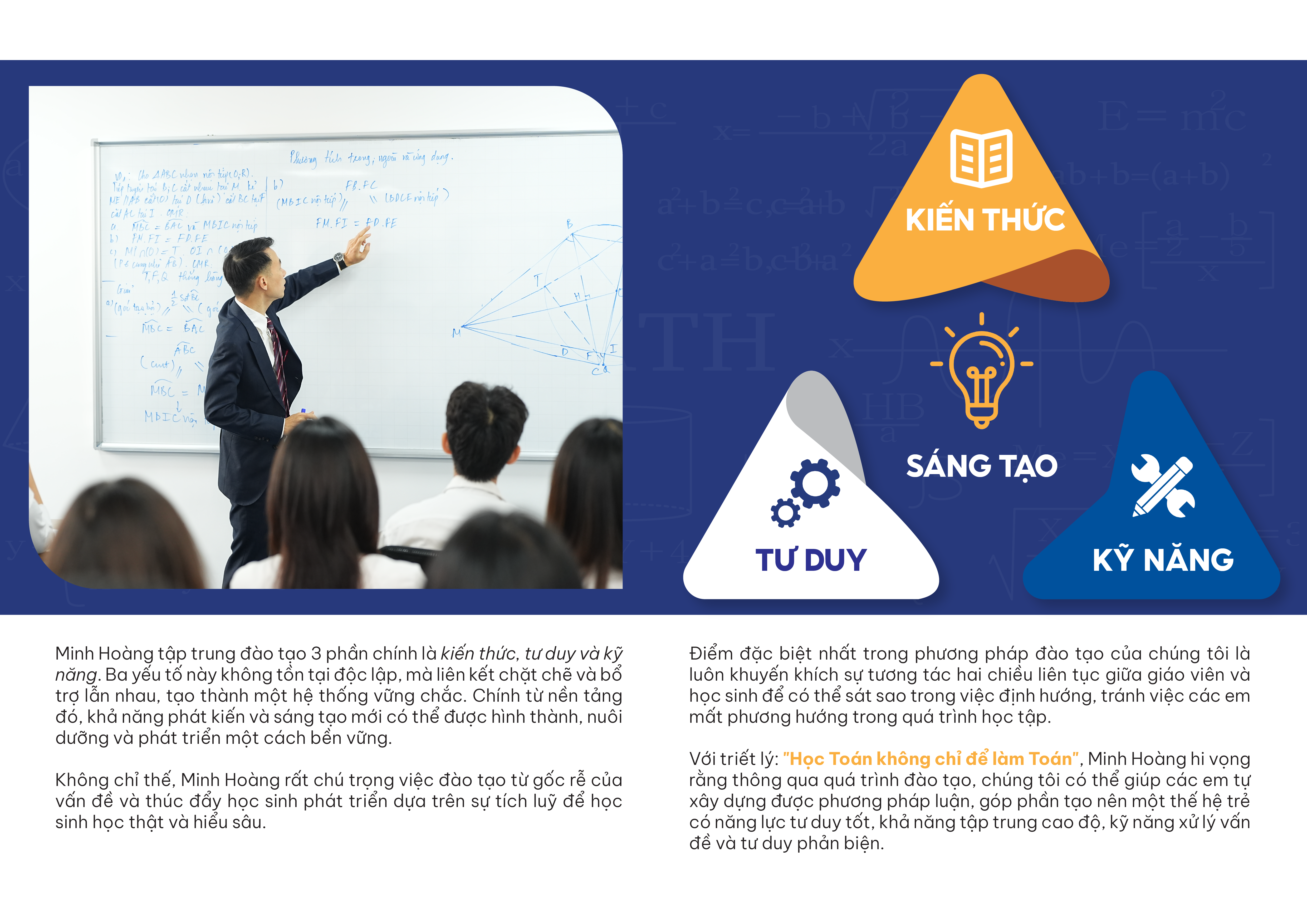 Chương trình đào tạo tại Minh Hoàng gồm các chương trình độc lập, được thiết kế chuyên biệt theo từng mục tiêu học tập: cơ bản, luyện thi, phát triển kỹ năng và ngoại ngữ, đáp ứng toàn diện nhu cầu của học sinh ở nhiều cấp độ khác nhau.